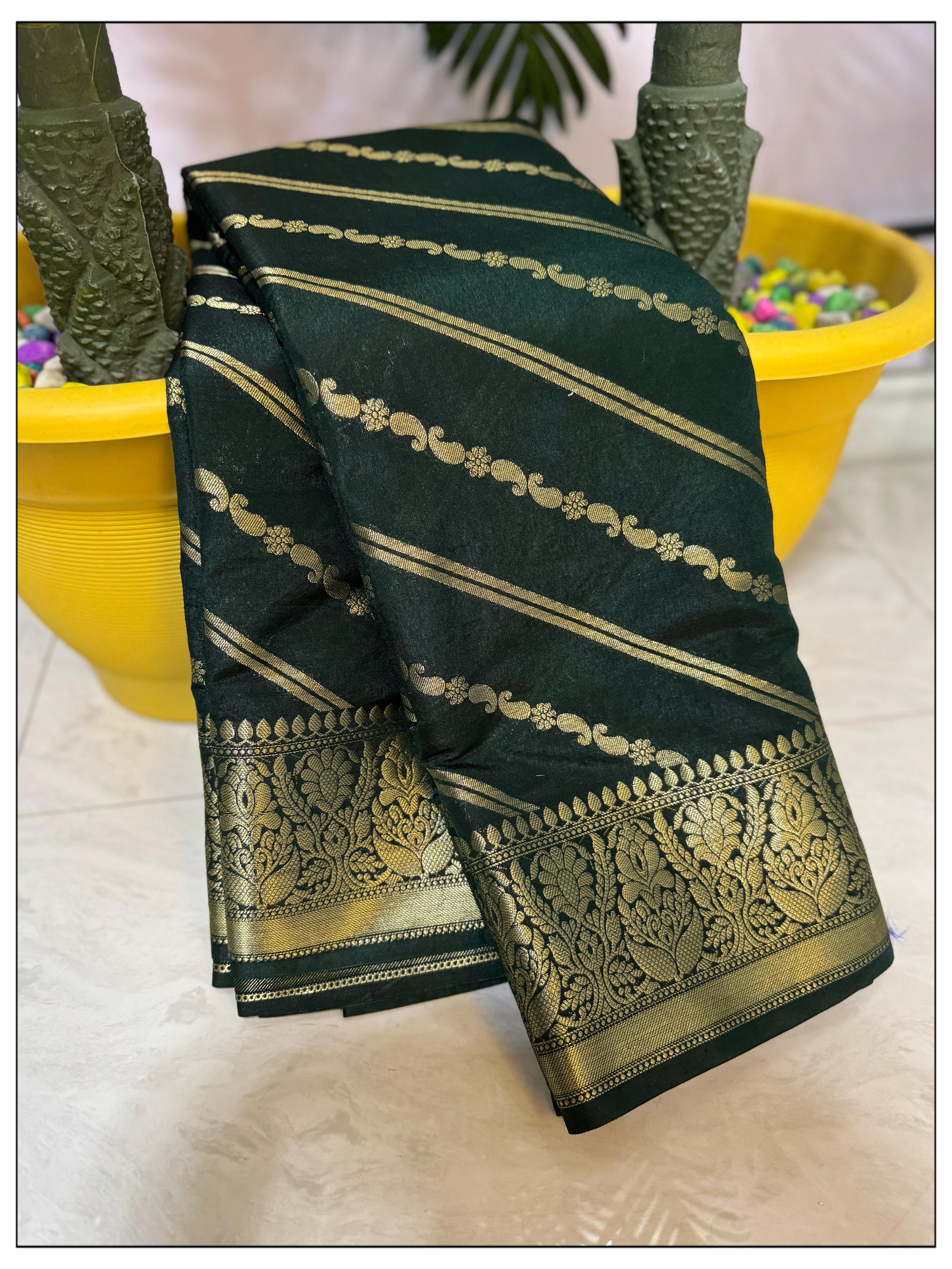 Experience the regal charm of this exquisite green Mysore silk saree. The luxurious silk fabric is intricately woven with rich gold zari, showcasing traditional motifs that reflect the heritage of Mysore craftsmanship. The elaborate pallu and border add a touch of opulence, making this saree perfect for weddings, festive occasions, and special celebrations. The deep green hue exudes a timeless elegance, ensuring you make a memorable impression. Drape yourself in the grandeur of this pure Mysore silk saree and celebrate the artistry of Indian textiles