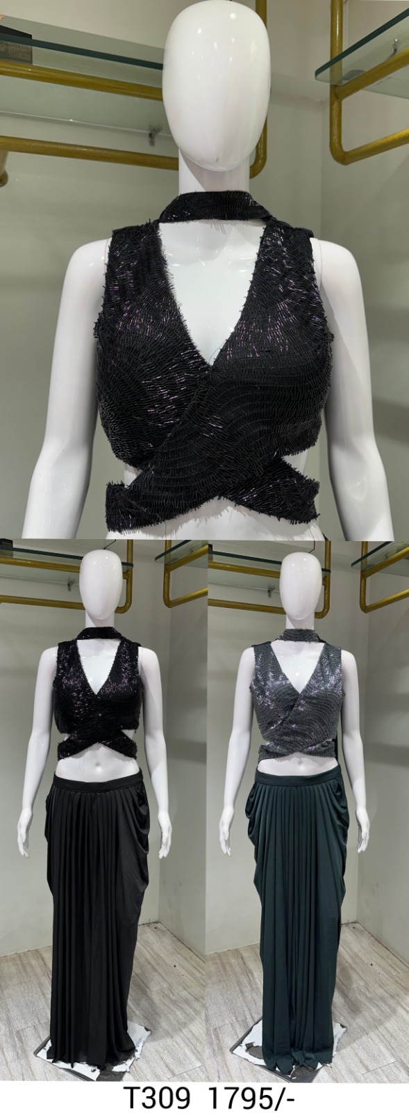 Introducing the T309 Embellished Crop Top with Dhoti Skirt Set, a contemporary and chic ensemble perfect for parties, festive occasions, and special events. This stylish co-ord set features a dazzling sequin-embellished crop top with a unique cut-out design and a high neckline, adding a touch of modern glamour.