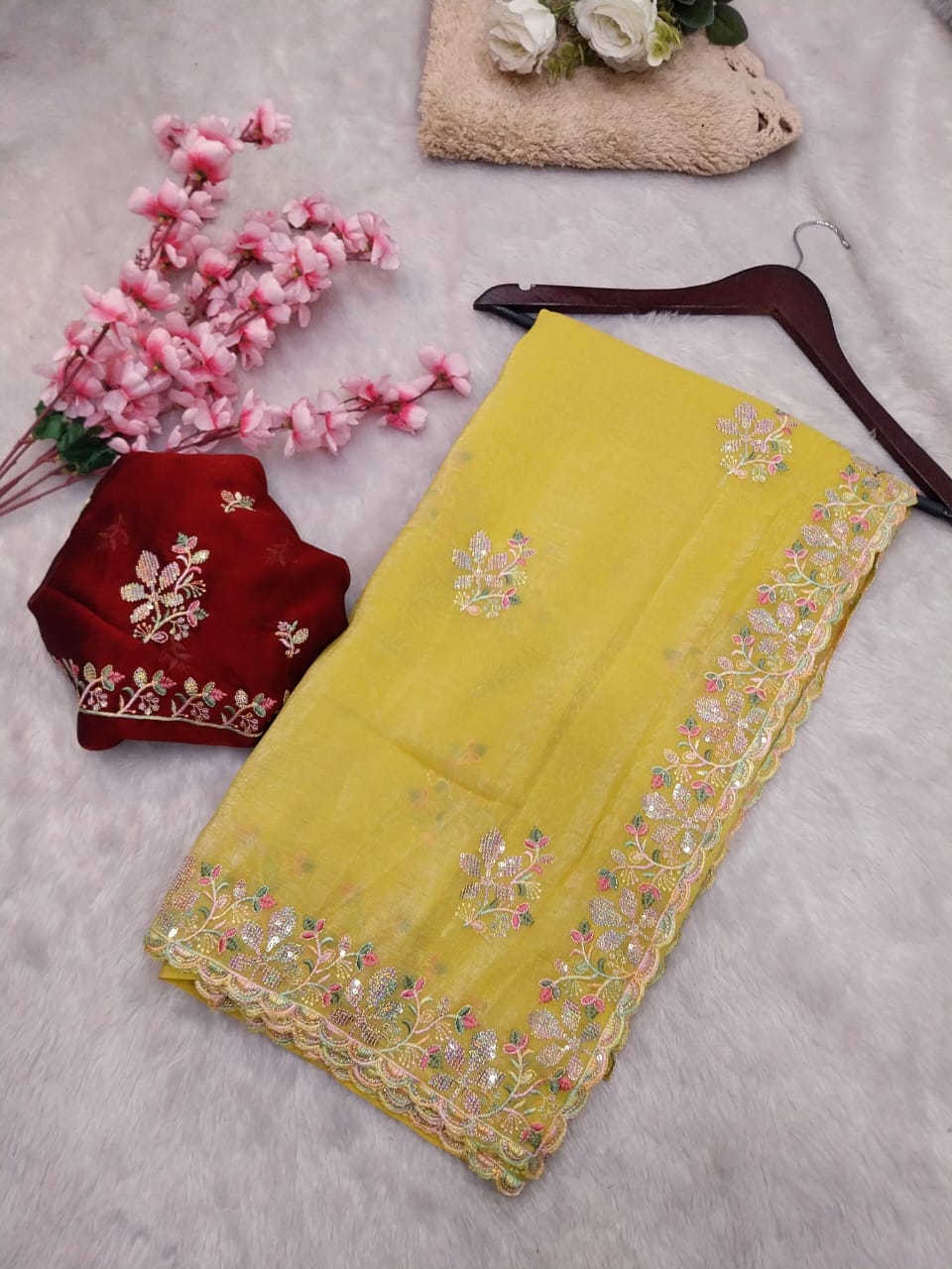 Indulge in the sweet charm of the NF 708 Candy Crush Saree. This delightful saree features a vibrant yellow hue, reminiscent of your favorite candies, and is adorned with intricate embellishments along the border and delicate motifs scattered throughout the fabric. The lightweight material ensures a graceful drape and comfortable wear, making it perfect for festive occasions, parties, and celebrations. The saree comes with a matching blouse piece, allowing you to create a complete and cohesive look. Embrace a blend of playful elegance and traditional craftsmanship with this stunning Candy Crush Saree.