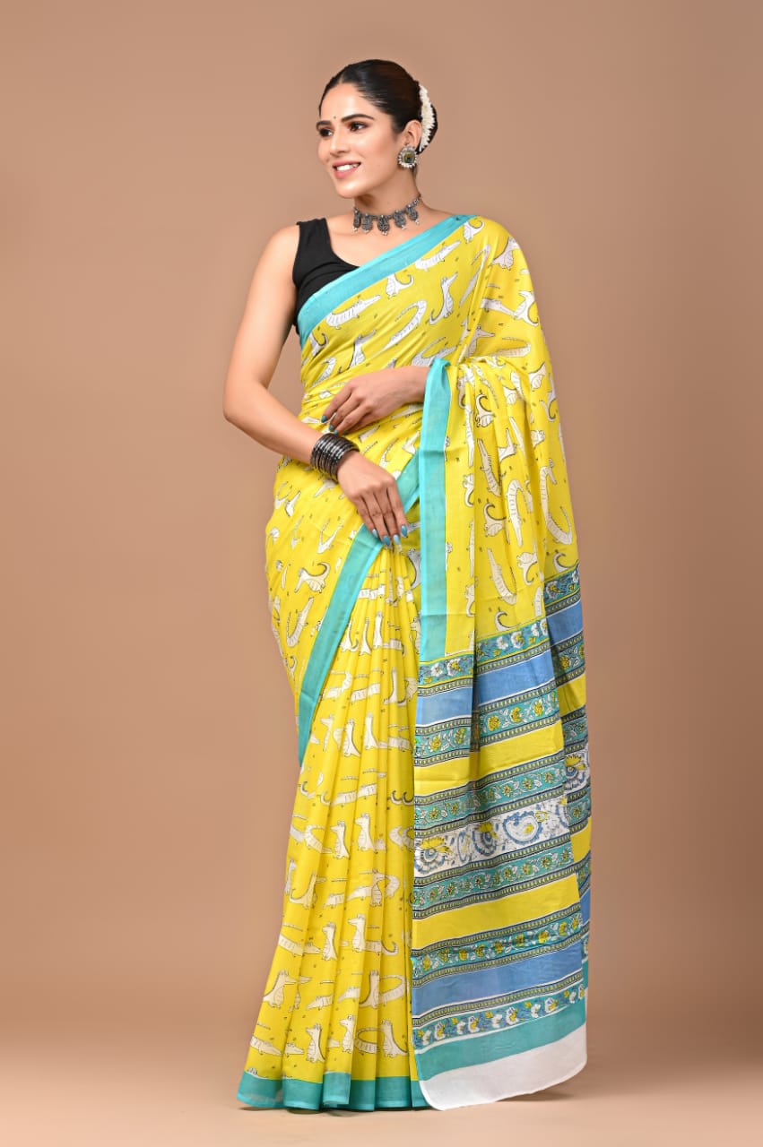 Embrace the breezy comfort and vibrant charm of this yellow printed cotton saree. This saree features a cheerful light yellow hue, crafted from soft, breathable cotton, making it perfect for everyday wear and casual occasions.