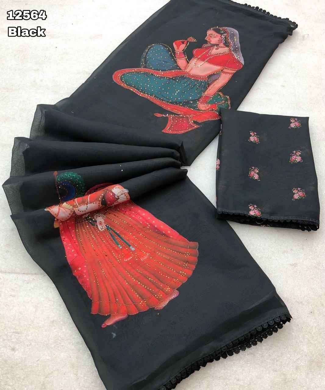 Exude sophistication in this black chiffon saree, featuring a captivating Kalamkari doll print. The soft, weightless fabric drapes gracefully, offering both comfort and a touch of cultural artistry. Perfect for evening events or adding a touch of classic elegance to your wardrobe.