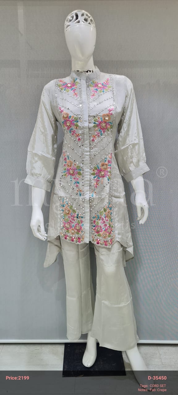The tunic top is designed with a mandarin collar and three-quarter sleeves, offering a refined and contemporary silhouette. It features intricate floral embroidery in vibrant hues of pink, green, and orange, adding a pop of color against the subtle silver grey backdrop. The embroidery is strategically placed down the center front, creating a visually appealing focal point. The tunic also boasts an asymmetrical hemline, adding a modern and unique touch.