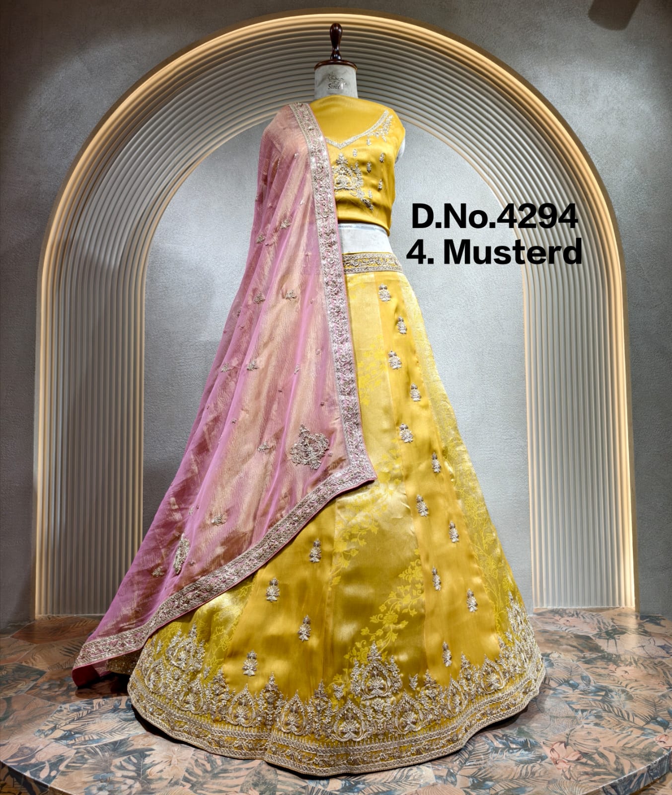 This image showcases a vibrant mustard yellow lehenga choli set, perfect for festive occasions and celebrations. The ensemble features a sleeveless blouse (choli), a voluminous skirt (lehenga), and a contrasting dupatta.