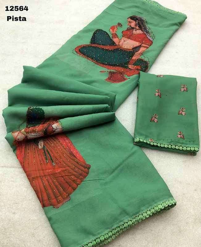 Indulge in the serene charm of this pista green chiffon saree. The lightweight and airy fabric drapes beautifully, offering a comfortable and graceful silhouette. Adorned with a captivating Kalamkari doll print, this saree showcases traditional Indian artistry with a contemporary touch. The soft, smooth texture of the chiffon adds a luxurious feel, making it perfect for both casual and festive occasions. The subtle pista green hue adds a refreshing and unique element to your wardrobe, ensuring you stand out with understated elegance. Pair it with delicate jewelry to complete a look that embodies both tradition and modern style