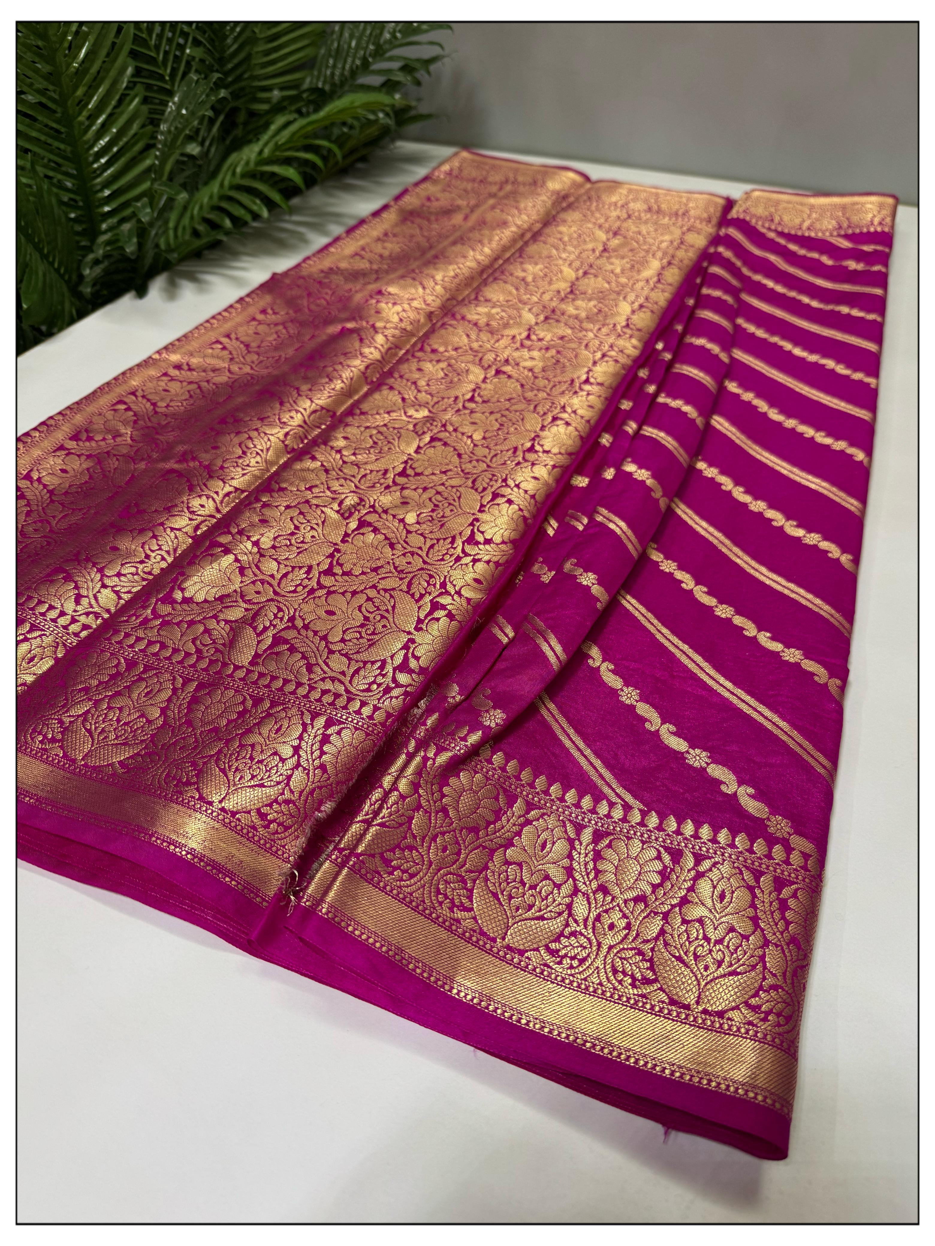 Experience the timeless elegance of this exquisite rani pink Mysore silk saree. The luxurious silk fabric is adorned with intricate gold zari work, featuring traditional motifs that showcase the rich heritage of Mysore craftsmanship. The elaborate pallu and border add a touch of opulence, making this saree perfect for weddings, festive occasions, and special celebrations. The deep magenta hue exudes a regal charm, ensuring you make a lasting impression. Drape yourself in the splendor of this pure Mysore silk saree and celebrate the artistry of Indian textiles.