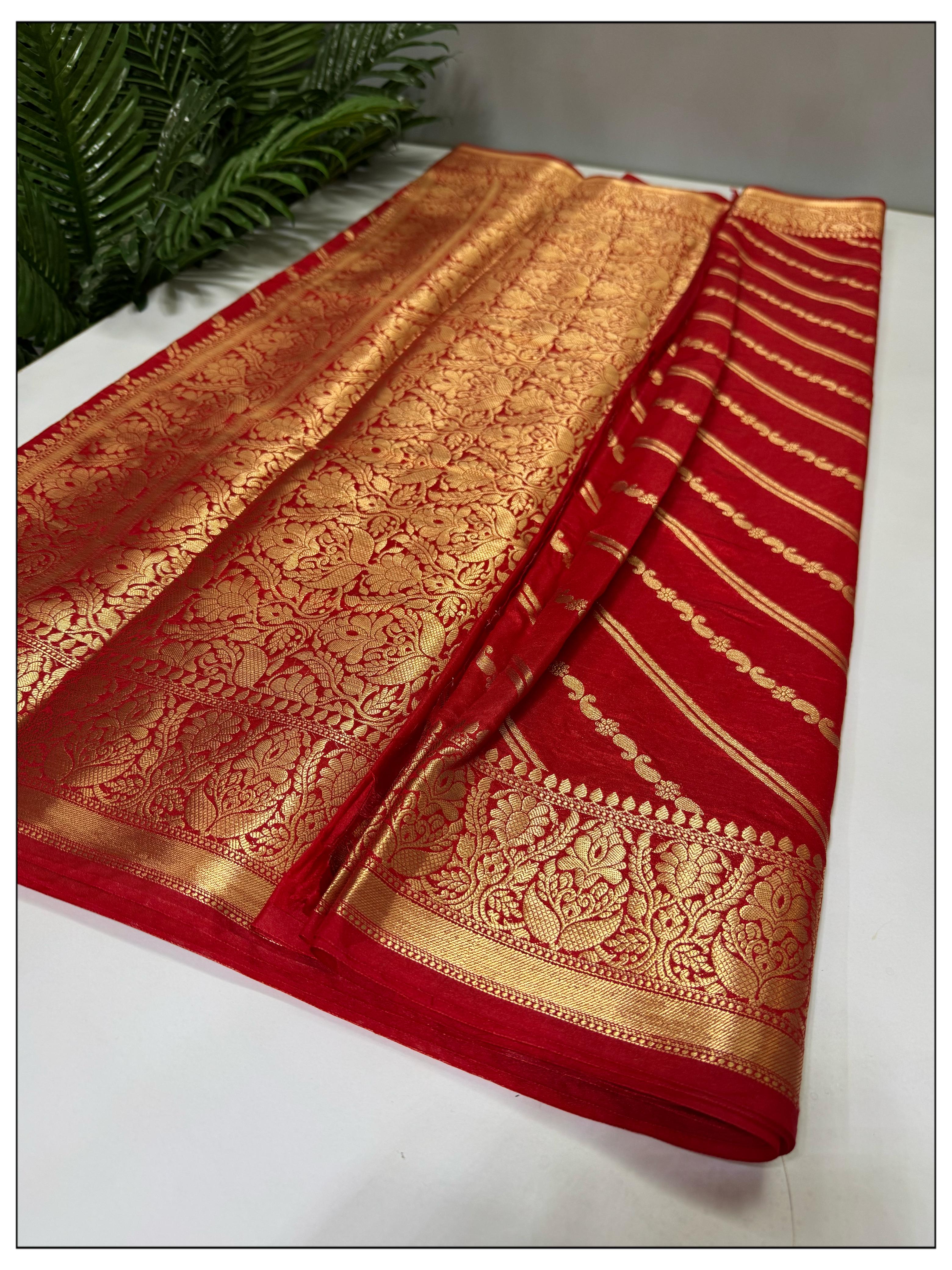 Radiate timeless elegance with this stunning red Mysore silk saree. The luxurious silk fabric is intricately woven with rich gold zari, showcasing traditional motifs that reflect the heritage of Mysore craftsmanship. The elaborate pallu and border add a touch of opulence, making this saree perfect for weddings, festive occasions, and special celebrations. The vibrant red hue exudes a classic charm, ensuring you make a memorable impression. Drape yourself in the grandeur of this pure Mysore silk saree and celebrate the artistry of Indian textiles.
