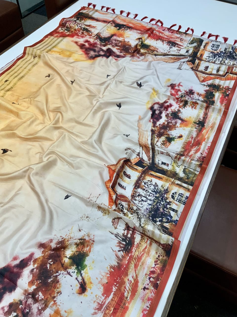 Experience a blend of art and elegance with this unique digital print saree. The design features an abstract architectural motif, reminiscent of classic buildings and landscapes, rendered in a painterly style with warm, earthy tones. The soft, flowing fabric drapes beautifully, making it perfect for both casual and semi-formal occasions. This saree is a statement piece that will add a touch of contemporary artistry to your wardrobe. The intricate digital print captures a sense of timeless beauty and modern sophistication.
