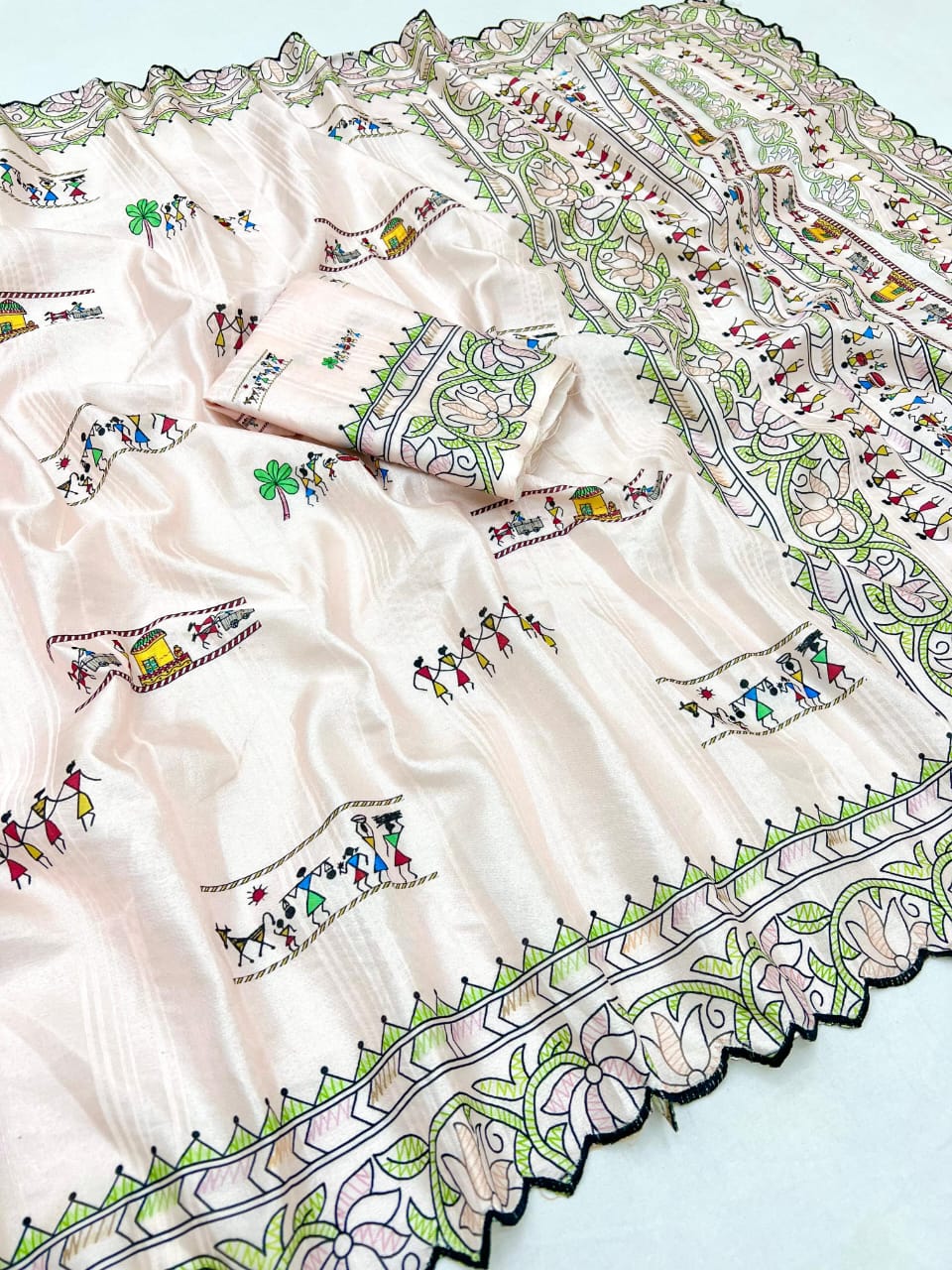 Experience the timeless charm of tribal artistry with this off-white art silk saree, adorned with hand-painted Warli motifs. The delicate fabric showcases intricate designs depicting scenes of daily life, rendered in the traditional stick-figure style of Warli art. The hand-painted details along the border and pallu add a unique, artisanal touch. The saree's lightweight silk blend offers a graceful drape, making it suitable for cultural events, festive occasions, or as a distinctive addition to your ethnic wardrobe. This piece celebrates the rich heritage of Indian folk art, blending traditional techniques with contemporary elegance.