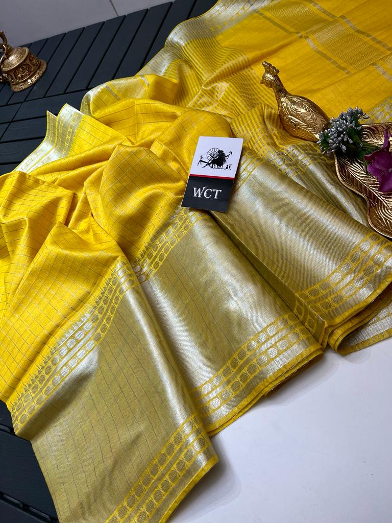 Radiate joy and elegance with this stunning sunshine yellow handloom saree from WCT. The vibrant yellow hue is beautifully complemented by rich gold zari work, creating a look that is both traditional and contemporary. The saree features a subtle checkered pattern woven into the fabric, adding depth and texture. The wide gold zari borders enhance the saree's luxurious appeal, making it perfect for festive occasions, weddings, and celebrations. The high-quality handloom fabric ensures a comfortable and graceful drape, while the radiant color and intricate details make this saree a standout piece in your ethnic collection.