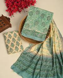 Grace meets tradition in this stunning teal and cream silk suit set, featuring intricate hand block-style floral and paisley prints inspired by Ajrakh patterns. The soft, lustrous silk fabric drapes beautifully, making it perfect for festive and semi-formal occasions. This coordinated set includes a top, bottom, and dupatta, bringing timeless style and rich texture to your ethnic wardrobe.
